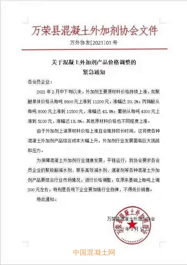 2021年年初,國際原油一路猛漲,短短4個月,其價格增長了35%左右,國內(nèi)化工產(chǎn)品價格持續(xù)飆升,以聚醚、丙烯酸和工業(yè)萘相關(guān)產(chǎn)品等為例的國內(nèi)減水劑主要原材料價格均出現(xiàn)明顯漲幅,近期,多個混凝土外加劑協(xié)會結(jié)合行業(yè)市場情況,進行價格調(diào)整,發(fā)布漲價通知。